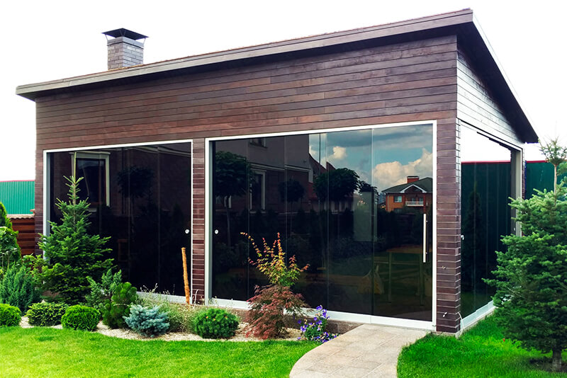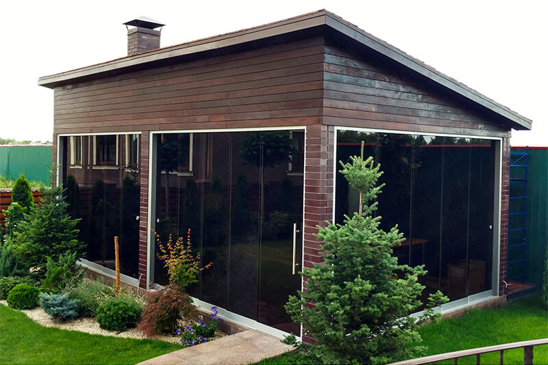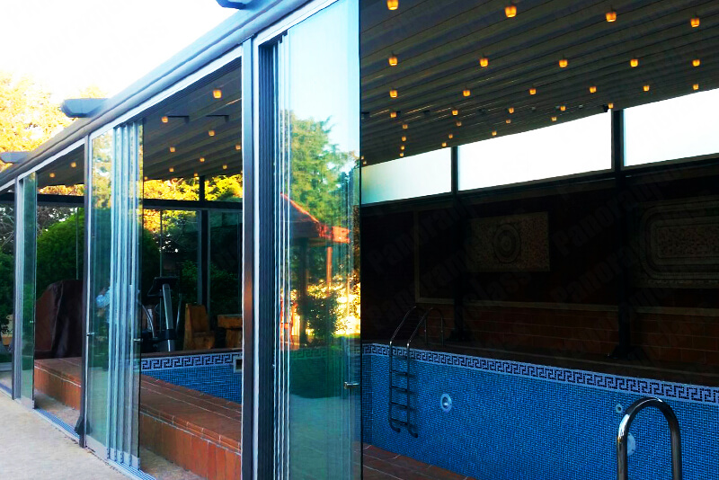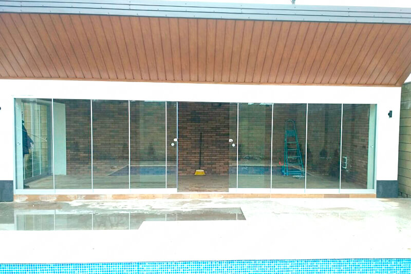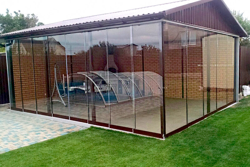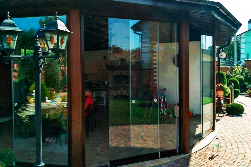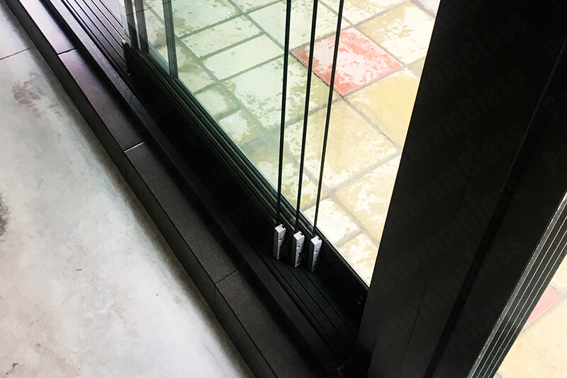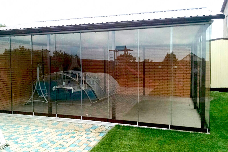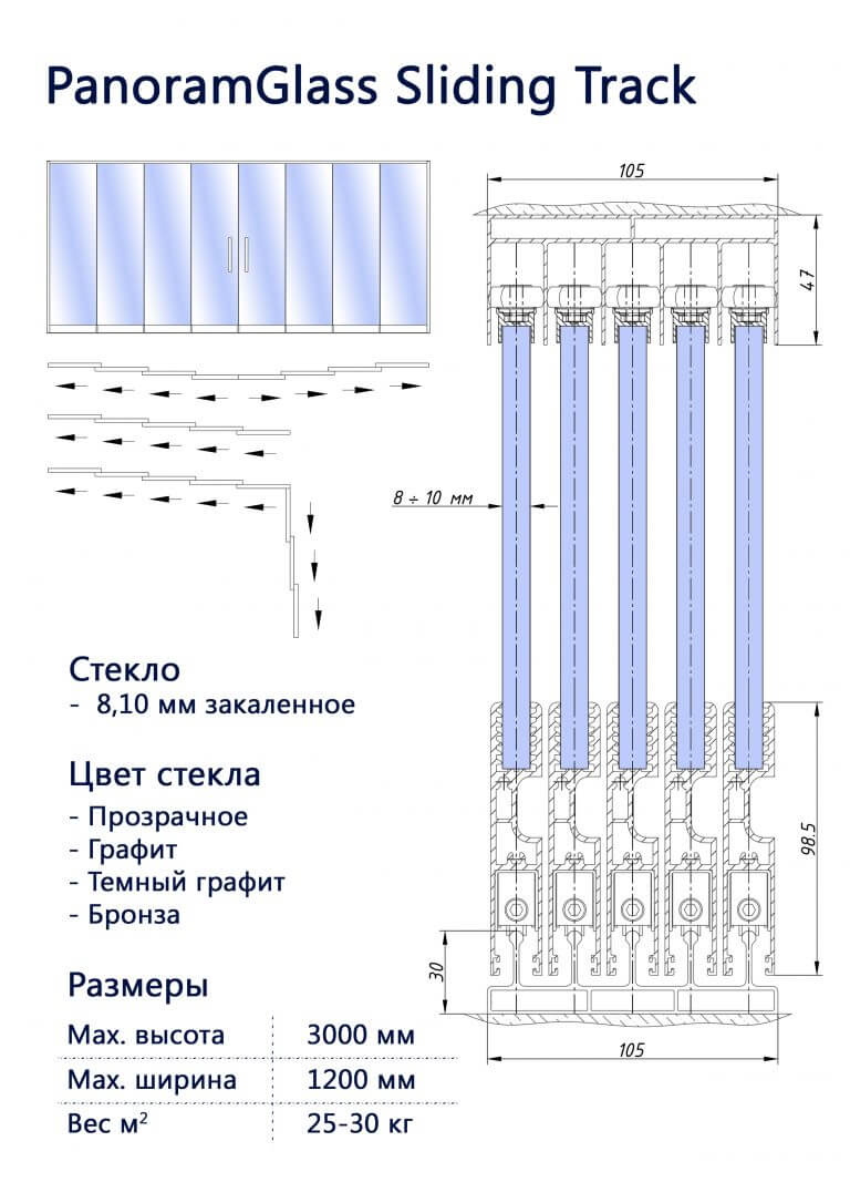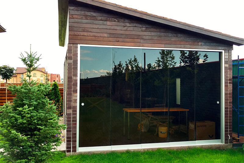 Безрамне розсувне скління SLIDING TRACK буває 3-х і 5-й доріжковим, на кожній доріжці стоїть своя стулка. Скло рухаються на роликах по полозах нижнього профілю, заїжджаючи одна за іншу, як скло в шафі-купе і утворюють, пакет з 5-и стулок з однієї зі сторін системи. Така технологія дозволяє відкривати 80% площі скління. Для довгих отворів доцільно робити системи на 10 стулок, по дві на кожному рейці, з відкриваням на дві сторони.